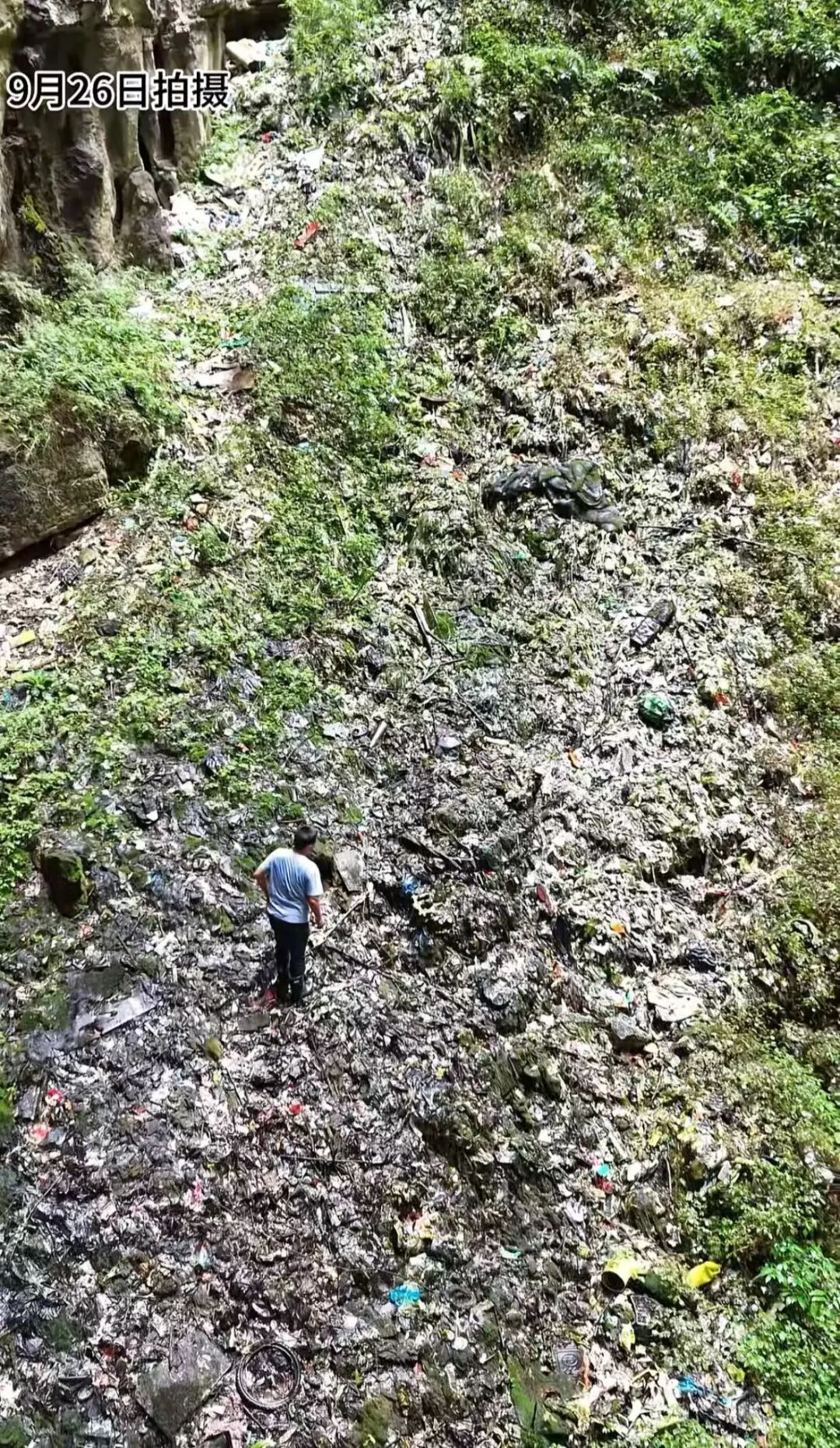 天坑、溶洞内垃圾堆积。图片来源:“渔猎齐哥”视频截图